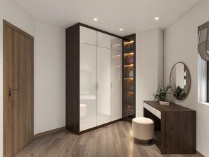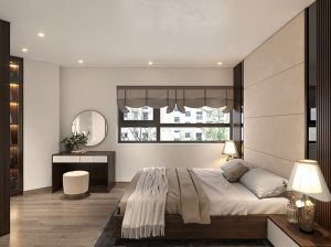Được trang trí theo phong cách hiện đại với giường ngủ vách PVC phối lam cao cấp, chăn ga màu pastel để tạo cảm giác ấm cúng. Góc bàn trang điểm gọn nhẹ với gương có viền đèn LED tích hợp giúp tăng sự tiện lợi cho việc trang điểm. Tủ quần áo lớn  giúp tiết kiệm không gian và giữ cho phòng luôn gọn gàng.