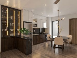 Thiết kế nhỏ gọn nhưng tối ưu hóa công năng, với khung tủ lạnh bằng gỗ màu trắng kem, tạo sự hài hòa với tổng thể không gian.Mặt bàn bếp được làm từ đá granite đen, nổi bật và dễ lau chùi. Bên cạnh đó, một tủ rượu trang trí được tích hợp vào hệ tủ, với cửa kính và đèn LED chiếu sáng để trưng bày các chai rượu yêu thích, vừa mang tính thẩm mỹ vừa tạo điểm nhấn sang trọng cho không gian.